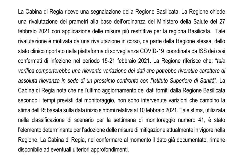 Presente Cabina di regia: niente rivalutazione della zona rossa Published 5 anni ago on Marzo 6, 2021 By Gianni Molinari Share Tweet Questo è lo stralcio del verbale della Cabina di Regia del ministero della Salute del 5 marzo che conferma la zona rossa della Basilicata e rigetta la richiesta di revisione fatta dalla Regione. Related Topics: Up Next 54 settimane dopo… Don't Miss Solo il lavoro vero salverà la Basilicata Continue Reading You may like