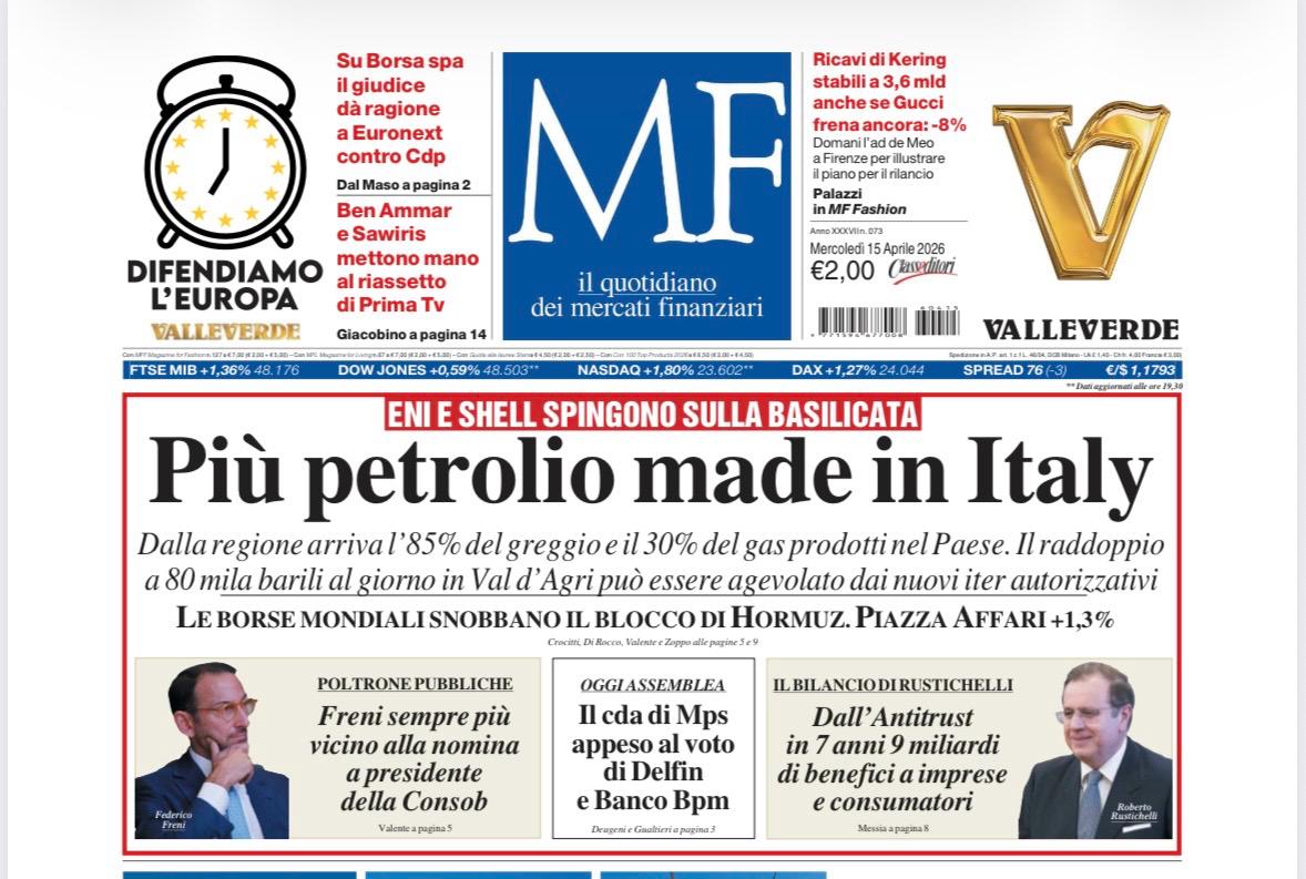 Il 15 aprile il quotidiano Milano Finanza apre l’edizione con “Più petrolio made in Italy”, “Eni e Shell spingono sulla Basilicata: Dalla regione arriva l’85% del greggio e il 30% del gas prodotti nel Paese. Il raddoppio a 80 mila barili al giorno in Val d’Agri può essere agevolato dai nuovi iter autorizzativi”.
